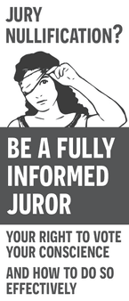 4" x 9", full-color rack card printed both front and back. Front side has information reminding people of the importance of their service as a fully informed juror. Back side has a flow chart guiding the reader through questions to consider in determining whether jury nullification is called for to deliver a just verdict.